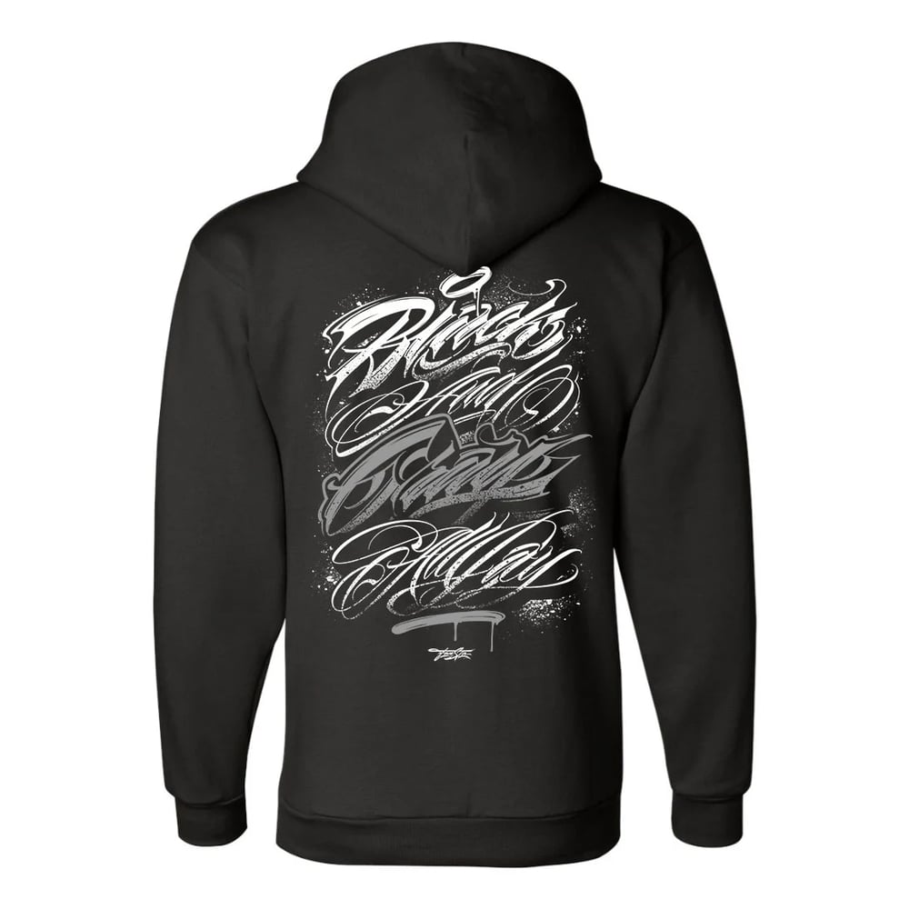 • Blackletter BLKxGRYALLMTHAFCKNDAY graphic on back